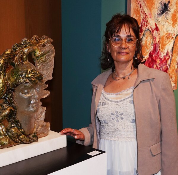 Trabalhos de pintura e escultura de Carmen dos Santos expostos no Centro de Exposições de Odivelas.